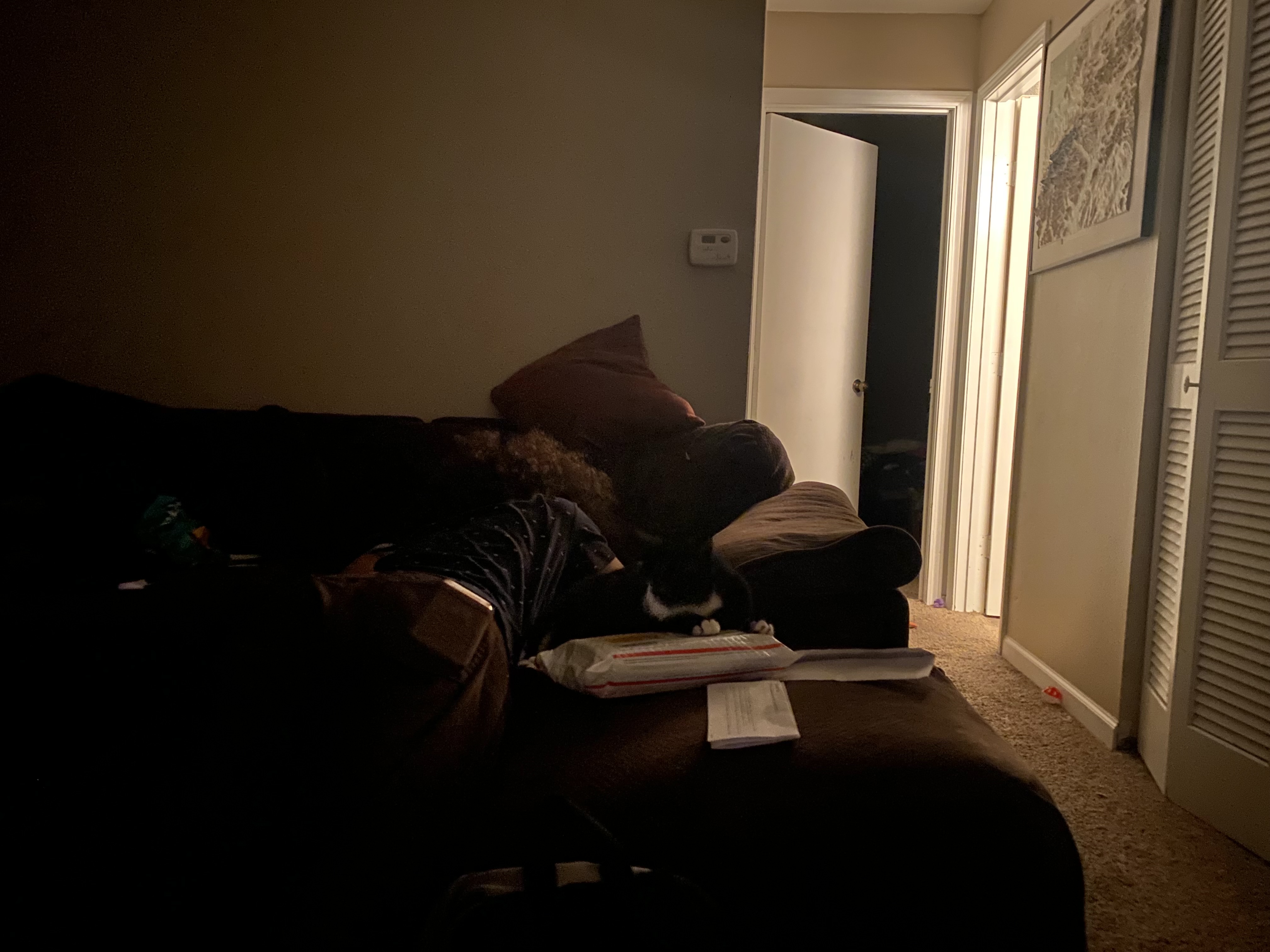we're both mid-twenties and dragging ourselves through jobs to make bills. but we are happy. we play board games together some nights, other times we just sit and watch tv shows together. we've been together for six-ish year. we obtained our cats by just being handed them. they both have feline herpes and i love them more than i thought i could ever love something.